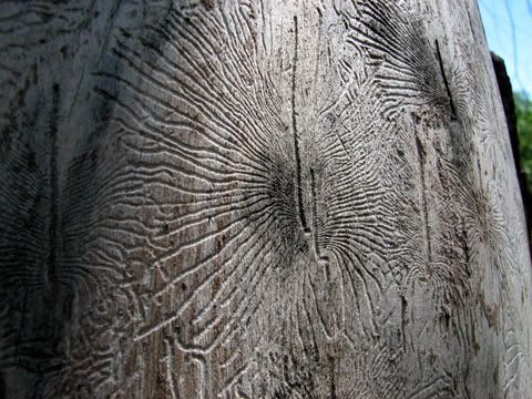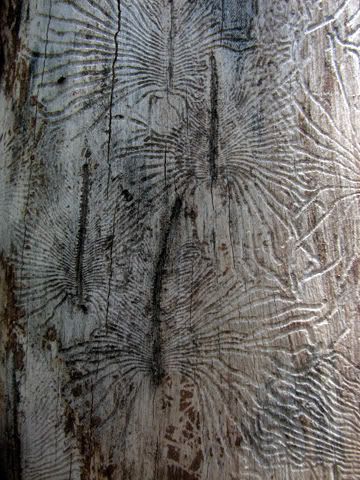One dead tree had an area of bark missing. There were black line segments on the white wood, with little curving paths carved into the wood spreading out from each. Some kind of beetle laid eggs in a line, and when they hatched, the little ones burrowed out in all directions. I don't know what kind of beetles they were, but the tracks they left were beautifully geometric. (Check it out here and here.)